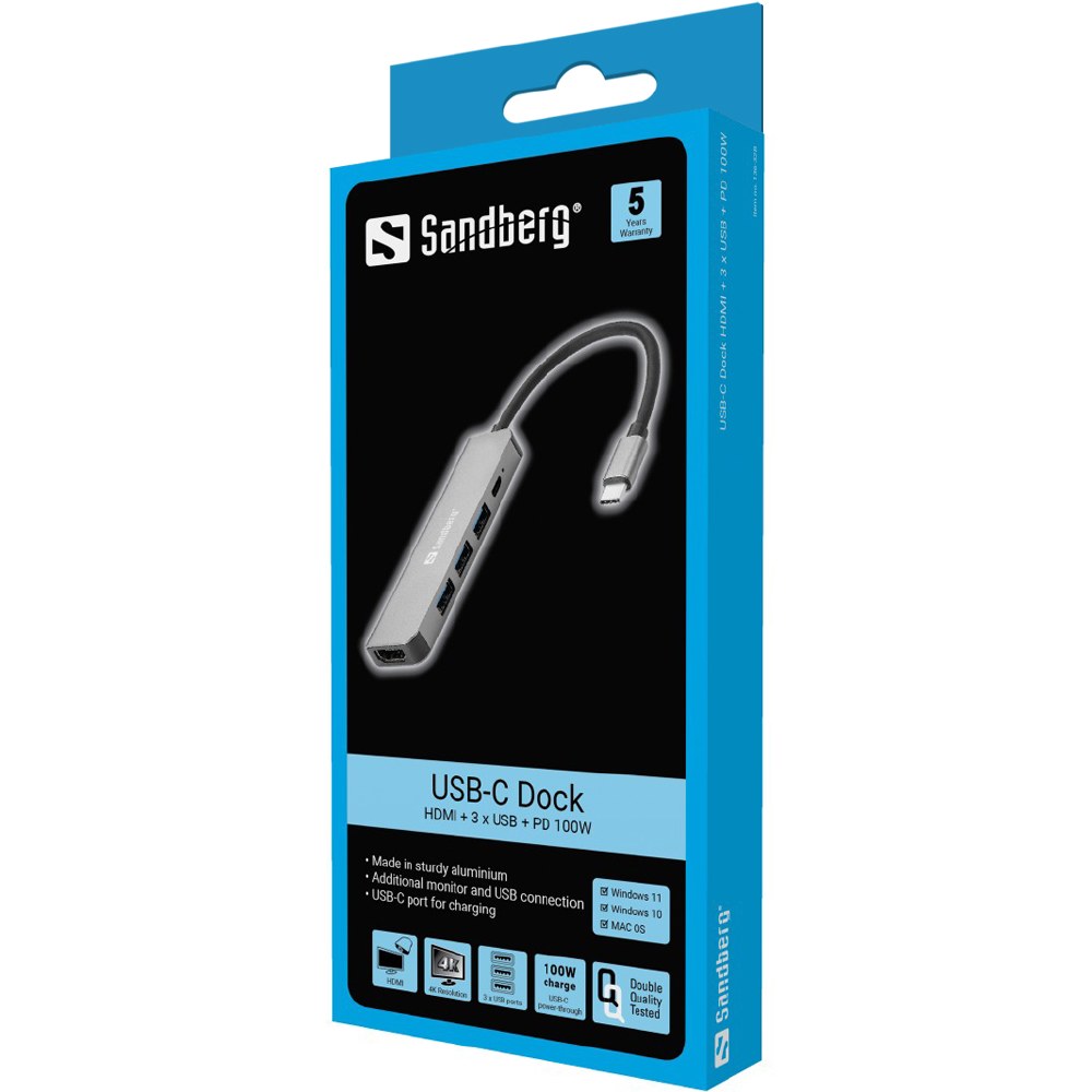 With the Sandberg USB-C Mini Dock HDMI+USB, you can use your USB-C port to connect a second monitor, TV or projector to your computer. You also get no fewer than three USB A ports for connecting USB devices. The USB-C connector has a power through facility, so your laptop won't run out of power while the dock is connected.
